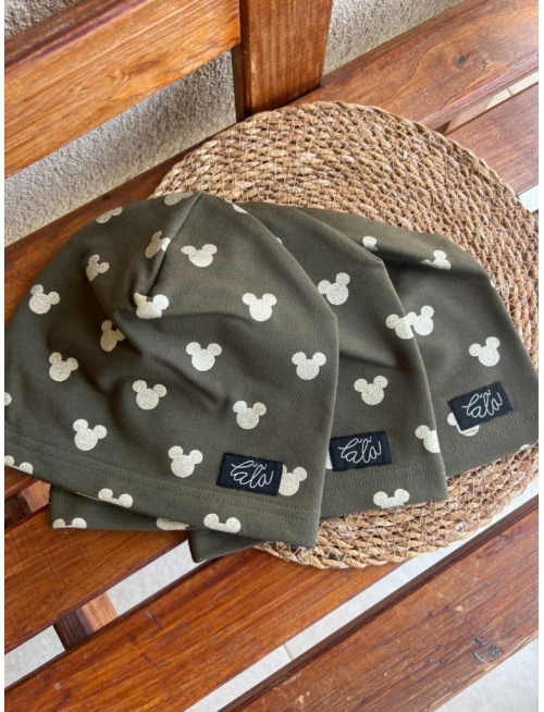 Tepláková šmolko čiapka - jednovrstvová - myšky na olivovej - LEN DO VYPREDANIA ZÁSOB