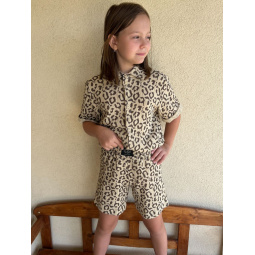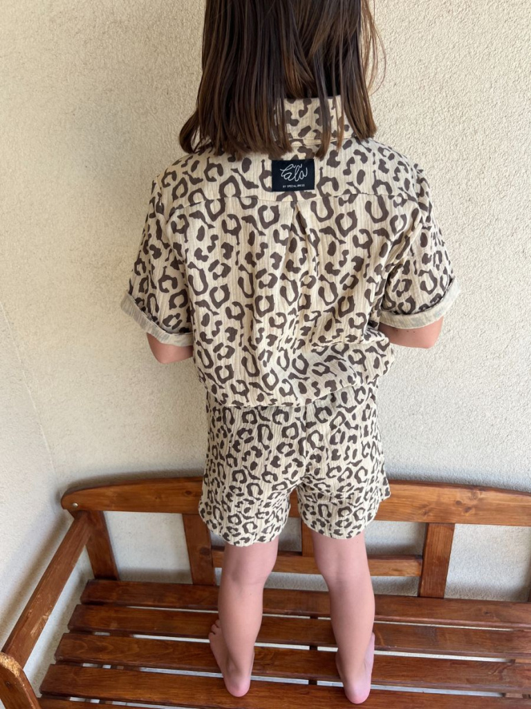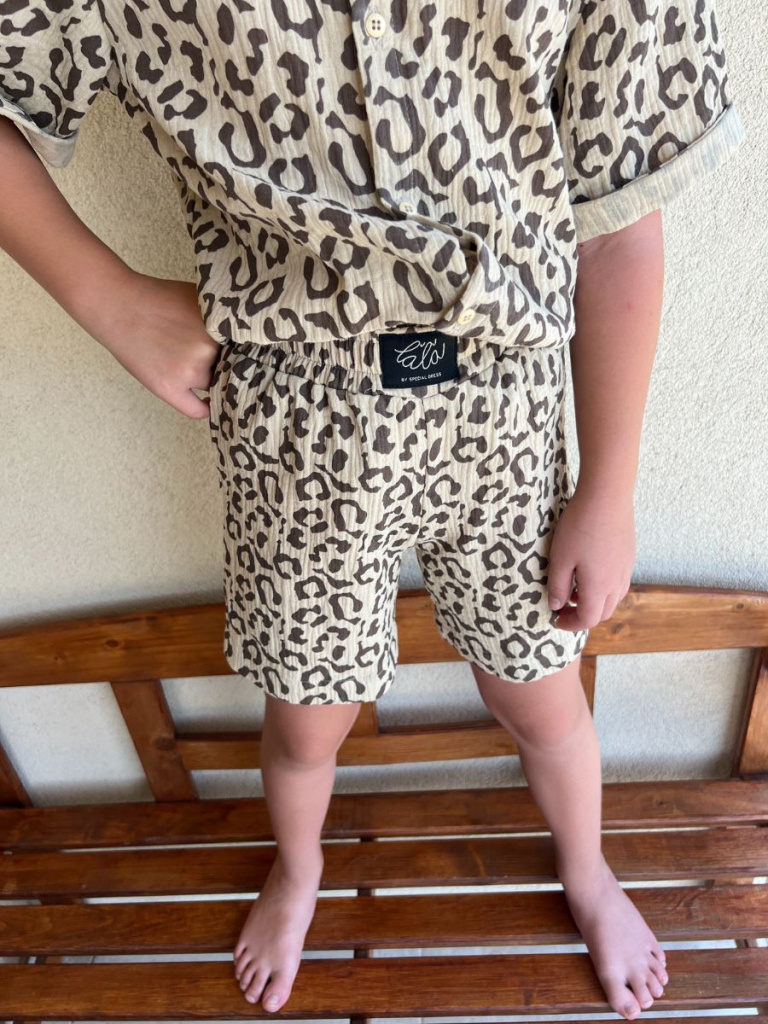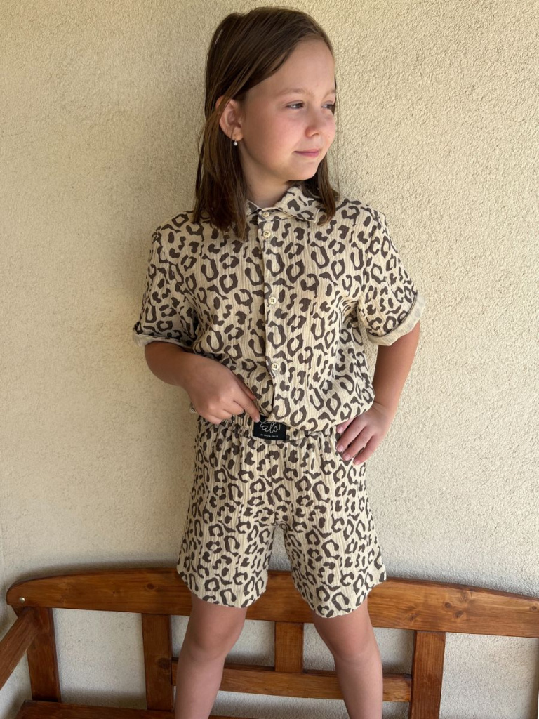 Chlapčenská súprava HAWAI z materiálu gázovina (košeľa + kraťasy). Chlapčenská košeľa má oproti dievčenskej košeli vyhnutú manžetku na rukáve a dolný kraj košele je rovný, širšie zahnutý. Súprava má na zadnom dieli košele pod sedlom špecifický protizáhyb pre šmrncovnejší vzhľad, a zároveň preto, aby bola vzdušná a dobre drobcovi sadla. Košeľu môže drobec nosiť napríkad aj šmrncovne zapravenú v gatiach alebo na pláži pri vode aj rozopnutú. Kraťasy sú v pohodlnom, rovnom, dostatočne voľnom strihu, bez volánika nad pásom.