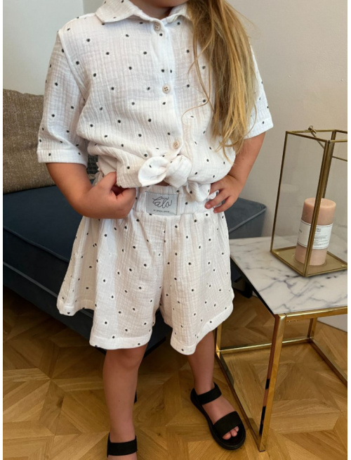 Dievčenská súprava HAWAI z materiálu gázovina (košeľa + kraťasy). Dievčenská verzia kraťasov je s volánikom nad pásom a strih kraťasov je rozšírený do širšieho Áčka. Dievčenská košela má v spodnej časti mierny oblúčik a je dosť dlhá na to, aby ste ju buď zapravili do kraťasov alebo zaviazali vpredu na uzol pre šmrncovnejší vzhľad, prípadne nechali uplne rozopnutú s nejakým tieločkom alebo športovou podprsenkou pod košeľou. Súprava má na zadnom dieli košele pod sedlom špecifický protizáhyb pre šmrncovnejší vzhľad, a zároveň preto, aby bola vzdušná a dobre detičkám sadla.