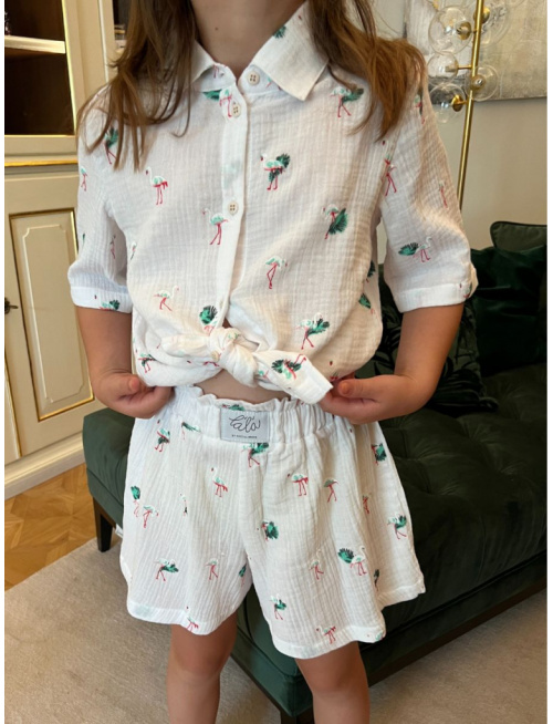 Dievčenská súprava HAWAI z materiálu gázovina (košeľa + kraťasy). Dievčenská verzia kraťasov je s volánikom nad pásom a strih kraťasov je rozšírený do širšieho Áčka. Dievčenská košela má v spodnej časti mierny oblúčik a je dosť dlhá na to, aby ste ju buď zapravili do kraťasov alebo zaviazali vpredu na uzol pre šmrncovnejší vzhľad, prípadne nechali uplne rozopnutú s nejakým tieločkom alebo športovou podprsenkou pod košeľou. Súprava má na zadnom dieli košele pod sedlom špecifický protizáhyb pre šmrncovnejší vzhľad, a zároveň preto, aby bola vzdušná a dobre detičkám sadla.