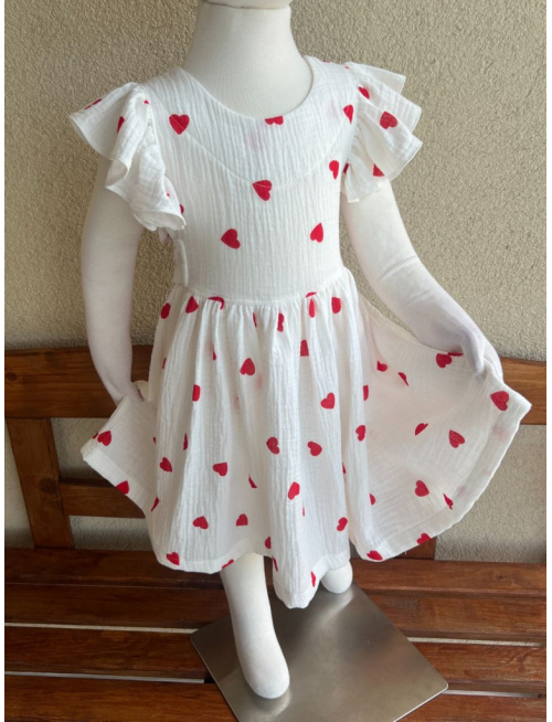 Šaty Valeriána - gázovina/mušelín - červené srdiečka na bielom podklade