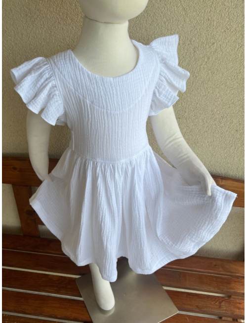 Kedže šaty Valéria v boho štýle patria medzi vaše najobľúbenejšie, zvolili sme takmer totožný strih s bohato riasenou sukňou aj pre gázovinu, kde je ale totožná dĺžka sukne vpredu aj vzadu. Šaty sú spestrené bohato riaseným volánom namiesto rukávov. Kedže sú šaty ušité z gázoviny, zapínanie vzadu je na gombík, aby prešli pohodlne cez hlávku. Šaty sú v páse dostatočne široké a šírku šiat si regulujete pridanou stuhou, ktorú slečne zaviažete vzadu na mašľu. Vďaka mašli ich v páse stiahnete tak, ako vám vyhovuje.
