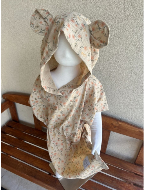 Detské pončo macko uši - kvety na pieskovej - gázovina/mušelín
