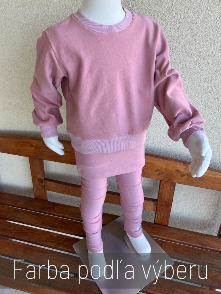 Poznámka k veľkostiam: Mikina sa šije v dvojčísliach (napr. 110/116, 122/128) a legíny v jednočísliach.