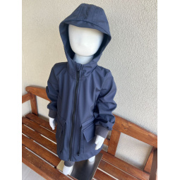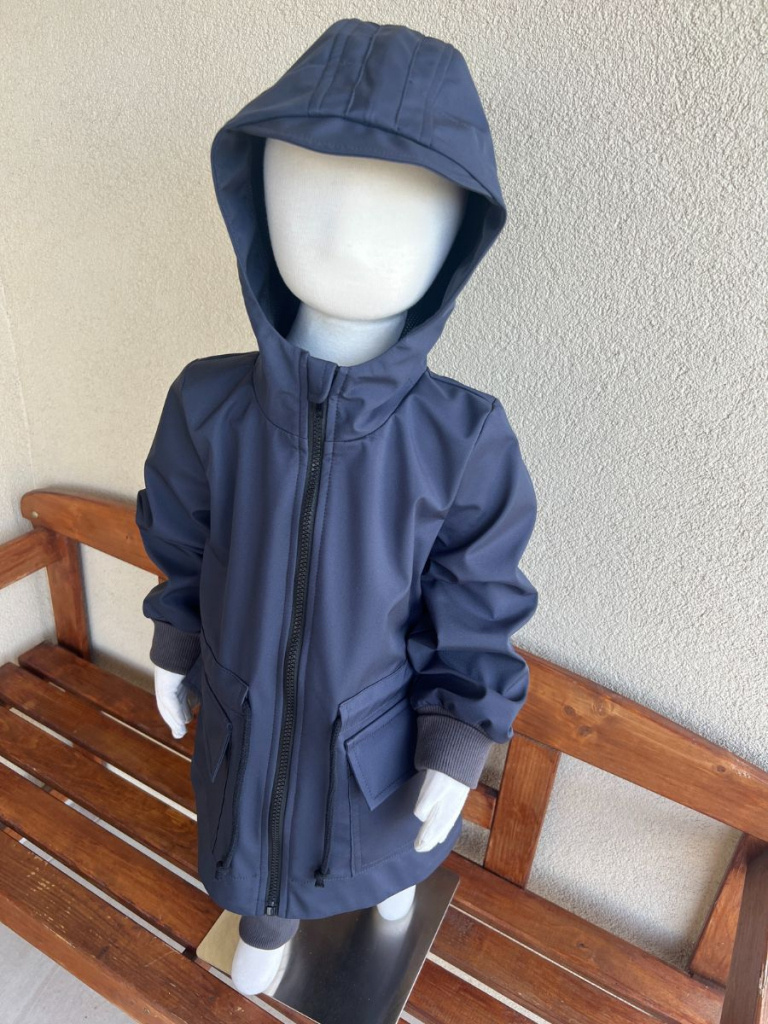 Prechodná prepracovaná sofshellová bundička je ušitá z jednej vrstvy jesenného softshellu. Bunda má funkčné nakladané prepracované vrecká a rastúce manžety. Zadný diel je predĺžený so zobáčikovým rázporkom. Bunda siaha pod zadok a sčasti chráni drobca pred mokrom pri sedení. V páse je funkčná sťahovacia šnúrka. Kapucňa je so stojáčikom, čiže parádne kryje krk pred vetrom. Kapucňa má pridaný šilt a tiež sťahovanie pre reguláciu hĺbky kapucne. Zips má podkryt, aby sa vetrík nedostal pod bundičku. Je vhodná do sychravého daždivého počasia. Celá bundička je navrhnutá tak, aby poslúžila aj ako pršiplášť, a tiež ako štýlová bundička.