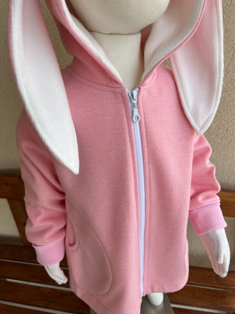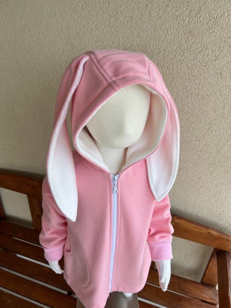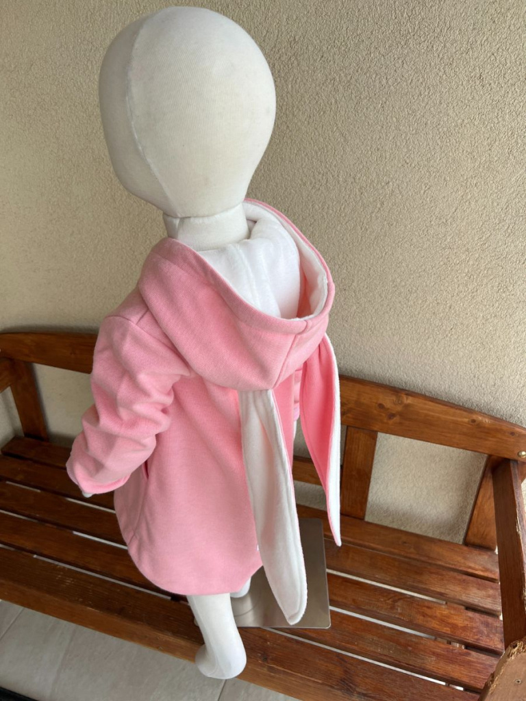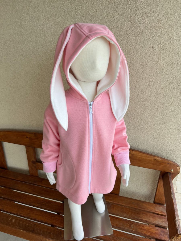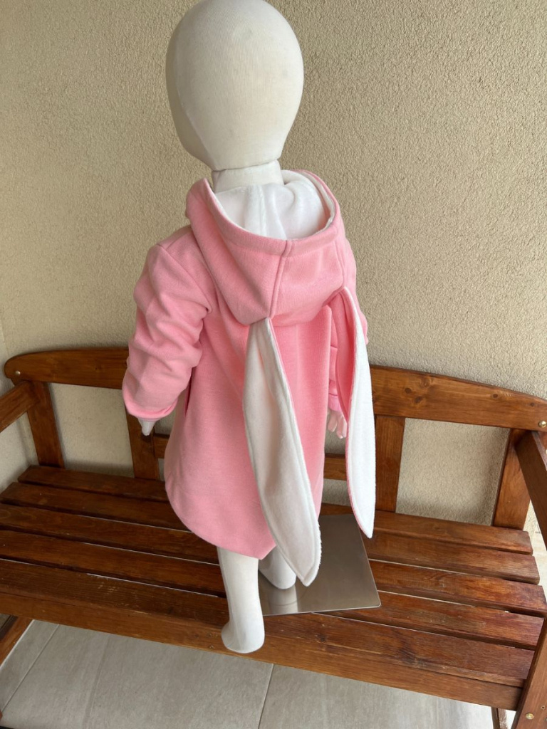 Rastúci kabátik mierne do A-čka, s vreckami a kapucňou. Zadný diel predĺžený so zobáčikovým rázporkom. Kabátik má rastúce manžety a ušká.