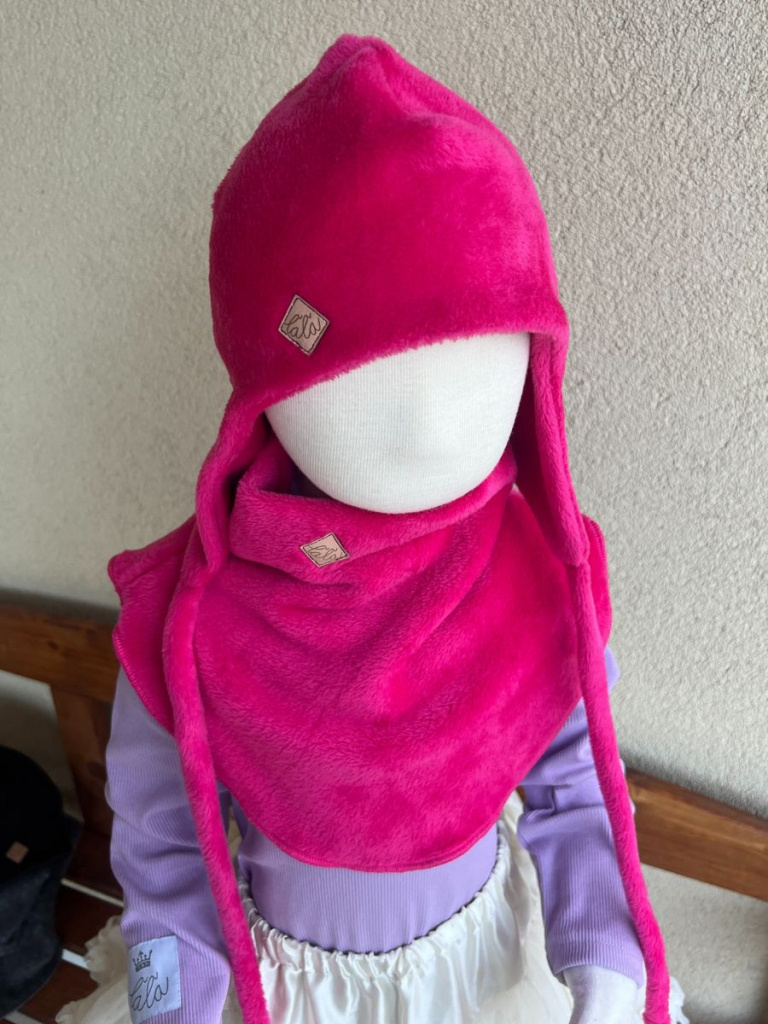 Dvojvrstvová ušiačka POLAR ušitá z chlpatej strany warmkeepru s exkluzívnou koženou etiketou. Tvar ušiačky pekne kryje ušká a malinkú časť šije. Výhodou ušiačky bez doplnov ako sú uši a bombule je tá, že na vrch dáte bez problému kapucňu bundy či overalu.