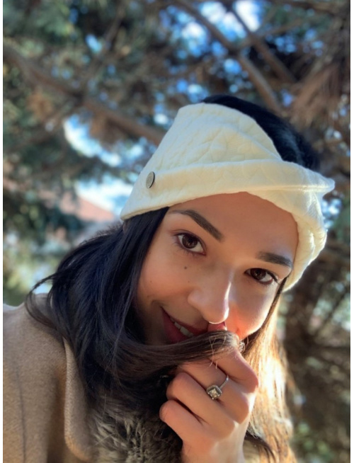 Elastická teplá čelenka ušitá v elegantnom preklopenom strihu. Elegantný efekt dotvára krúžková etiketa kovového vzhľadu. Tento druh etikety sa dá bežne prať v práčke.