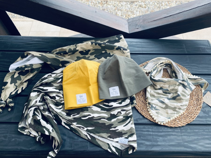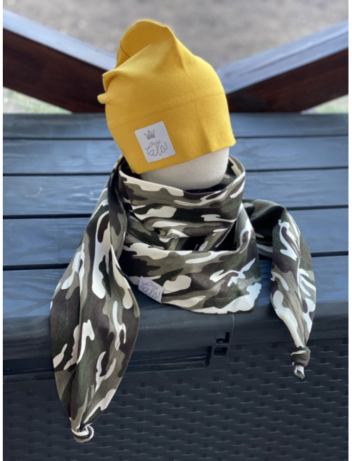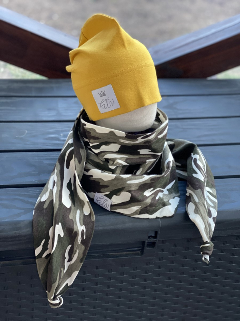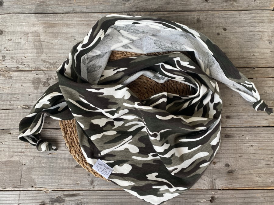 Tepláková šatka v maskáčovom vzore veľkosťou navrhnutá tak, aby sa dala omotať dvakrát okolo krku. Šatka sa šije v jednej UNI veľkosti: šírka šatky 130 - 135 cm, výška šatky v strede v cípe 42 cm.