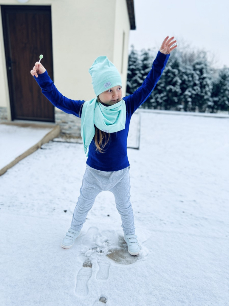 Tepláková jednofarebná šatka veľkosťou navrhnutá tak, aby sa dala omotať dvakrát okolo krku. Šatka sa šije v jednej UNI veľkosti: šírka šatky 130 - 135 cm, výška šatky v strede v cípe 42 cm (K05-1).