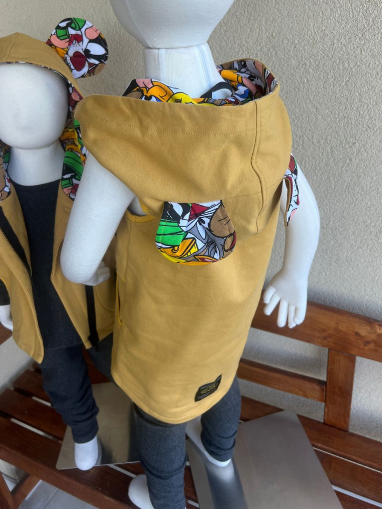 Rastúca PARMA vesta so šikmozipsom a uškami - ALEX - francúzska horčica + vzor - POSLEDNÝ KUS