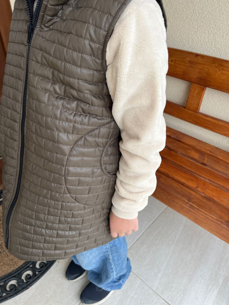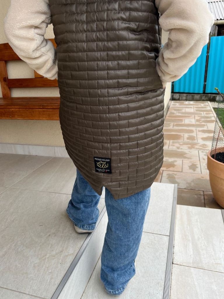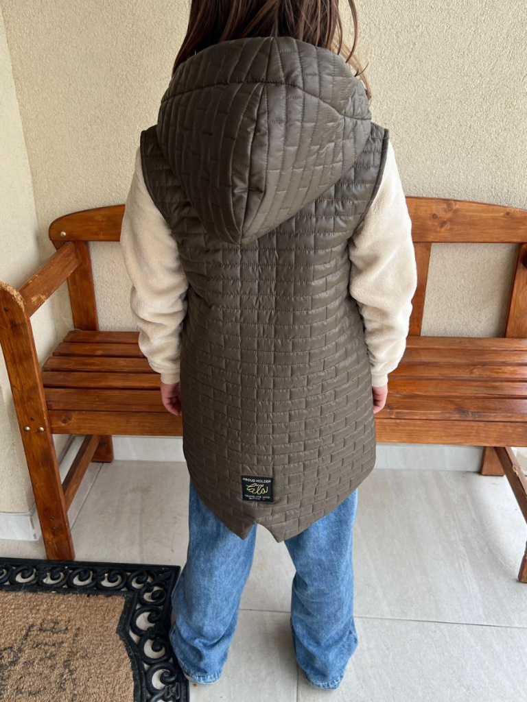 Prepracovaná vestička podšitá podšívkou, preto je teplá a vhodná na obdobie jeseň/zima. Vestička je rastúca, strihovo mierne do A-čka, s vreckami a kapucňou so stojačikom pre efektnejšie krytie krku. Zadný diel predĺžený so zobáčikovým rázporkom. Materiál plní funkciu podobne ako softshell - ide o teplú a vode a vetru odolnú vestu.